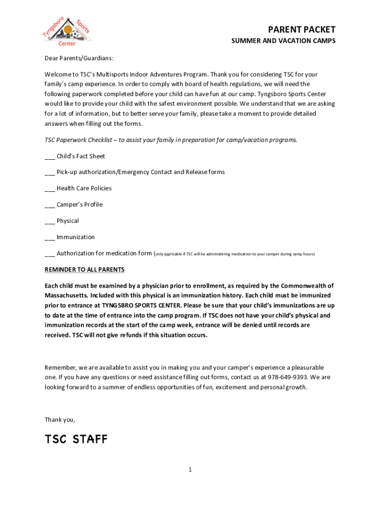 PARENT PACKETSUMMER AND VACATION CAMPSDear Parents/Guardians:Welcome to TSCs Multisports Indoor Adventures Program. Thank you for considering TSC for yourfamilys camp experience. In order to comply