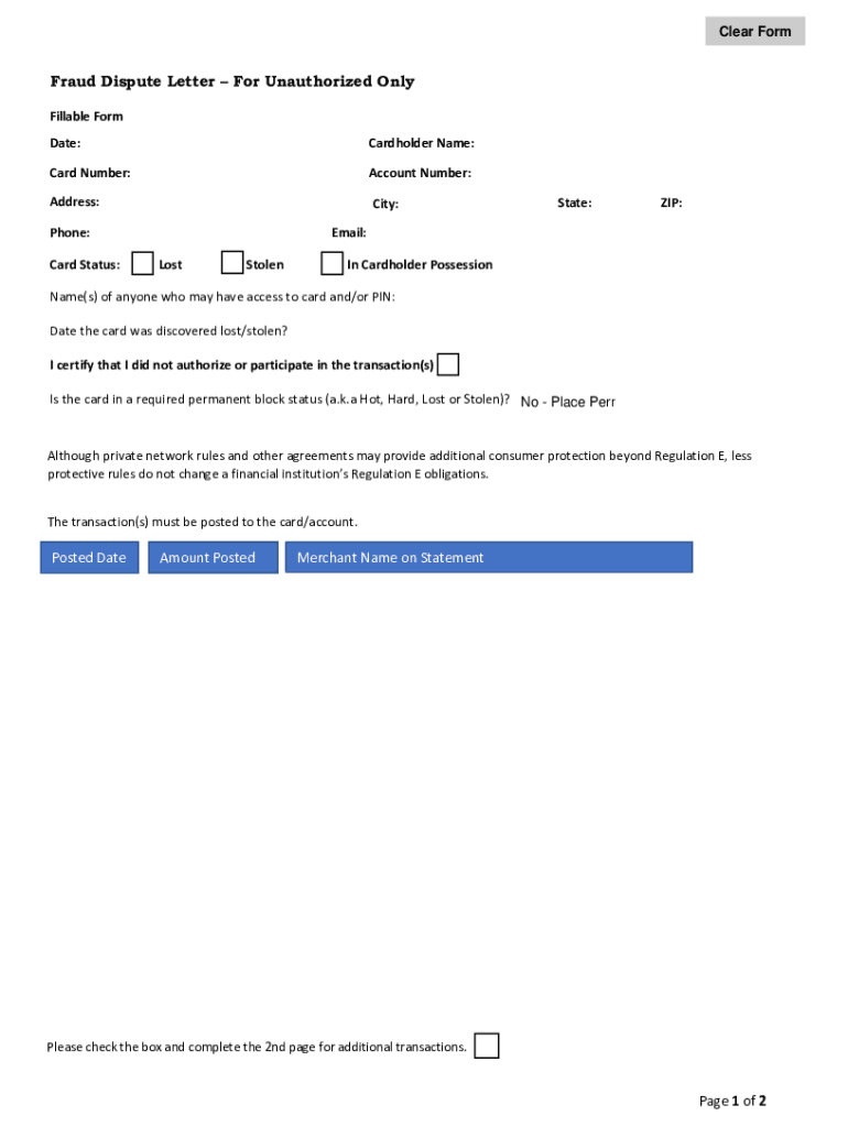 Clear FormFraud Dispute Letter For Unauthorized Only Fillable Form Date:Cardholder Name:Card Number:Account Number:Address:City:Phone: Card Status:State:ZIP:Email: LostStolenIn Cardholder PossessionName(s)