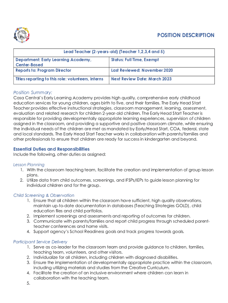 Lead Teacher (2yearsold) (Teacher 1,2,3,4 and 5)