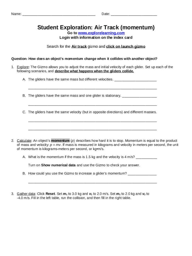 The Student Exploration: Air Track (momentum) is a writable document you can get filled-out and signed for specific reasons. Then, it is provided to the relevant addressee to provide certain details of any kinds. The completion and signing is able manually in hard copy or with an appropriate application like PDFfiller. Such tools help to fill out any PDF or Word file without printing out. It also lets you edit its appearance for your requirements and put a valid digital signature. Upon finishing, the user sends the Student Exploration: Air Track (momentum) to the recipient or several of them by email and even fax. PDFfiller has got a feature and options that make your Word form printable. It offers a number of settings for printing out. No matter, how you'll file a document - physically or electronically - it will always look neat and clear. To not to create a new file from scratch over and over, turn the original form into a template. Later, you will have a rewritable sample.