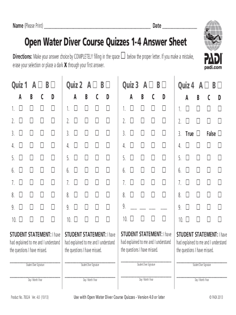 Name (Please Print) ___ Date ___Open Water Diver Course Quizzes 14 Answer Sheet Directions: Make your answer choice by COMPLETELY filling in the space below the proper letter. If you make a mistake,