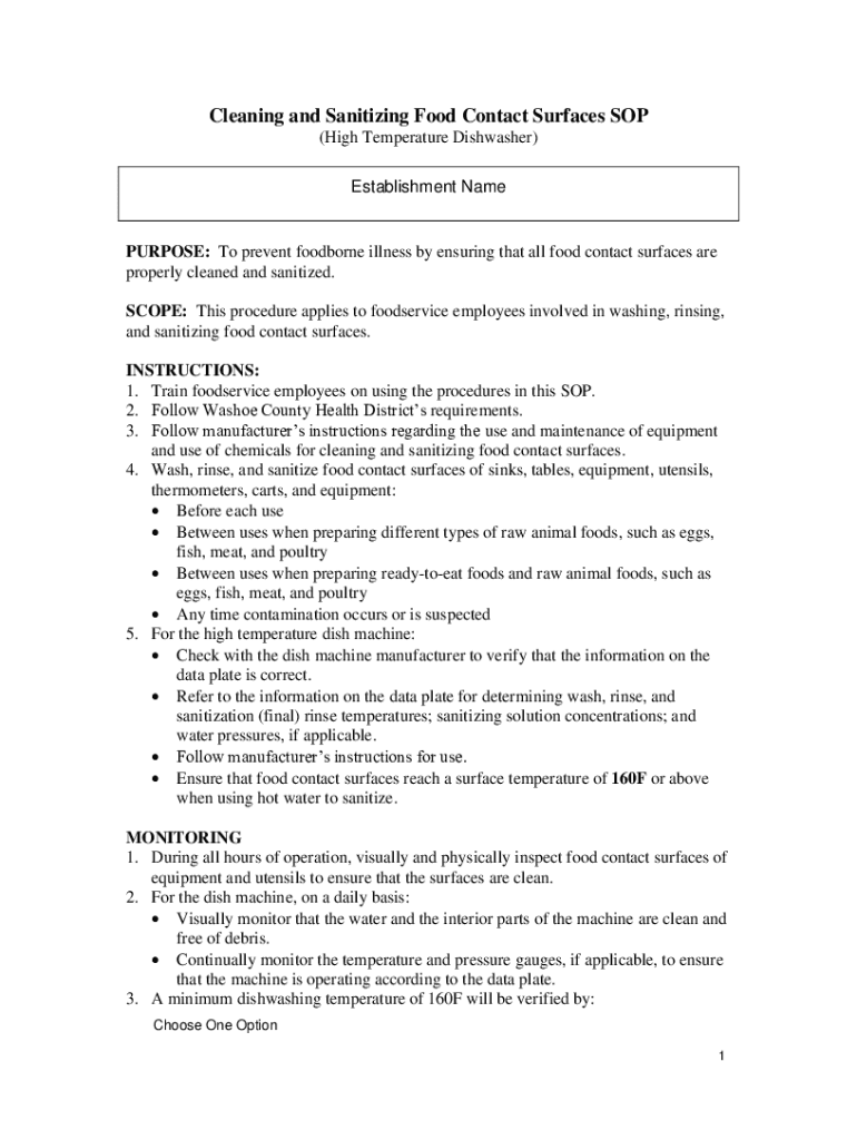 Cleaning and Sanitizing Food Contact Surfaces SOP (High Temperature Dishwasher) Establishment NamePURPOSE: To prevent foodborne illness by ensuring that all food contact surfaces are properly cleaned