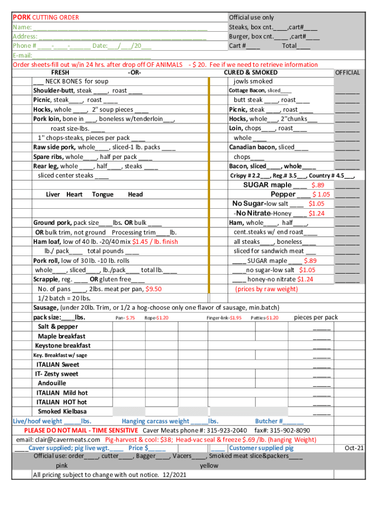 PORK CUTTING ORDEROfficial use only Steaks, box cnt.___,cart#___ Burger, box cnt.___ ,cart#___ Cart #___ Total___Name: ___ Address: ___ Phone # _________ Date:___/___/20___ Email:___ Order sheetsfill