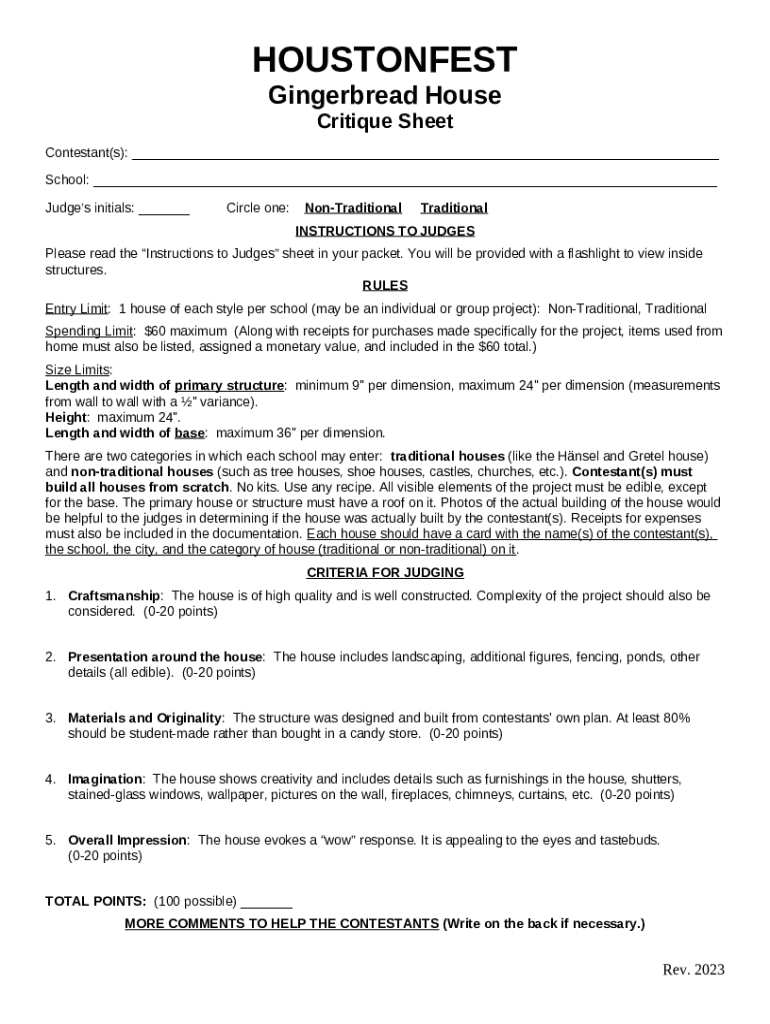 Template HOUSTONFEST Gingerbread House Critique Sheet instructions