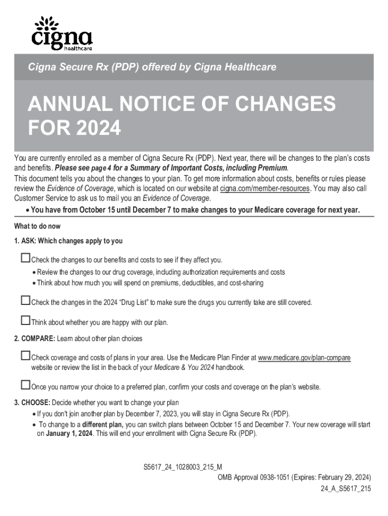 Cigna Secure Rx (PDP) offered by Cigna HealthcareANNUAL NOTICE OF CHANGES FOR 2024 You are currently enrolled as a member of Cigna Secure Rx (PDP). Next year, there will be changes to the plans costs