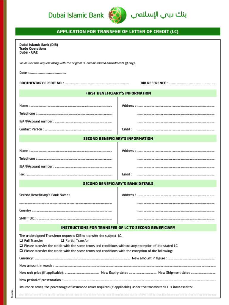 APPLICATION FOR TRANSFER OF LETTER OF CREDIT (LC)
