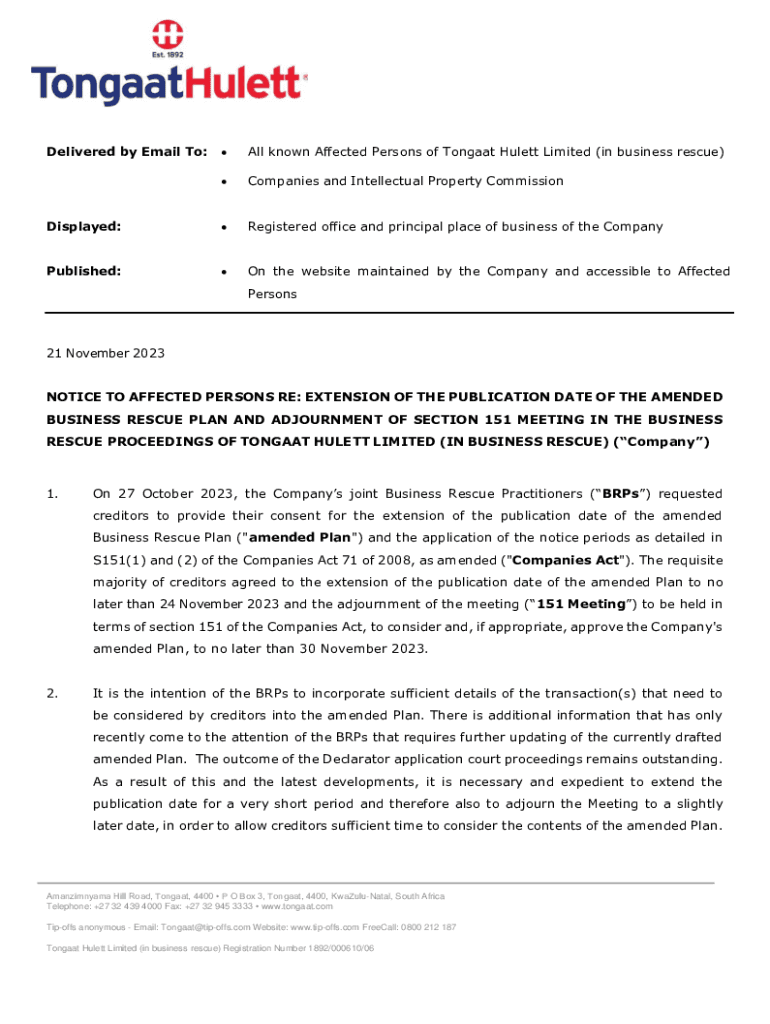 Delivered by Email To:All known Affected Persons of Tonga at Hubert Limited (in business rescue)Companies and Intellectual Property CommissionDisplayed:Registered office and principal place of business