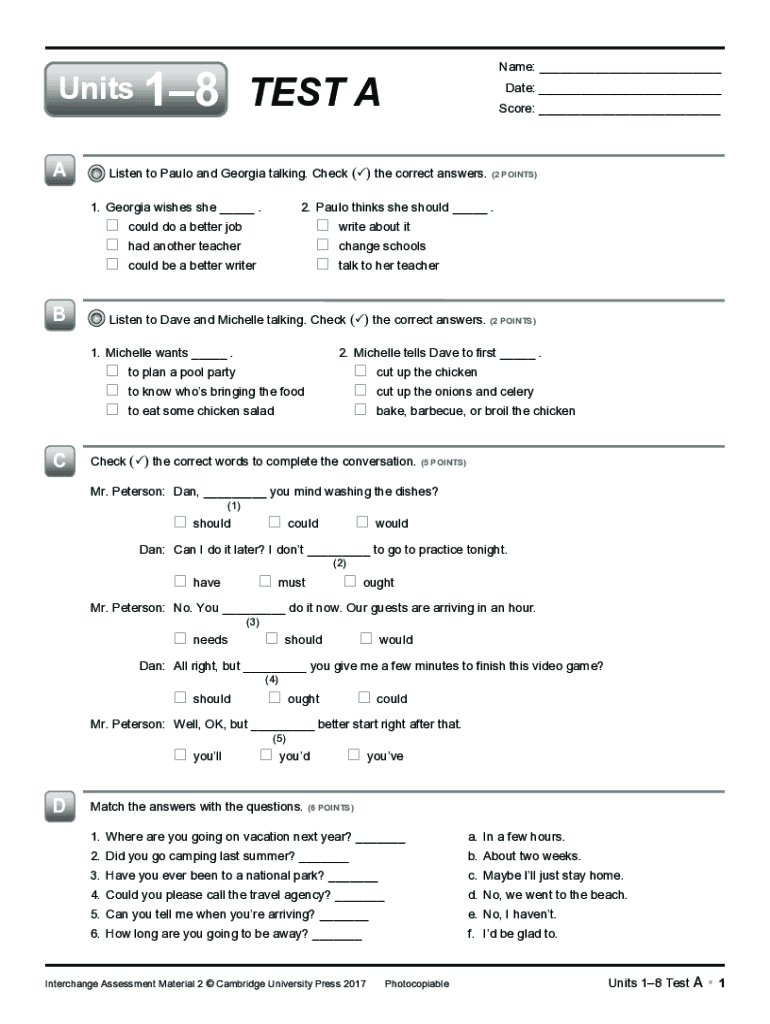 Units 18 ATEST A write about it change schools talk to her teacherListen to Dave and Michelle talking. Check (P) the correct answers. (2 POINTS)1. Michelle wants ___ .2. Michelle tells Dave to first