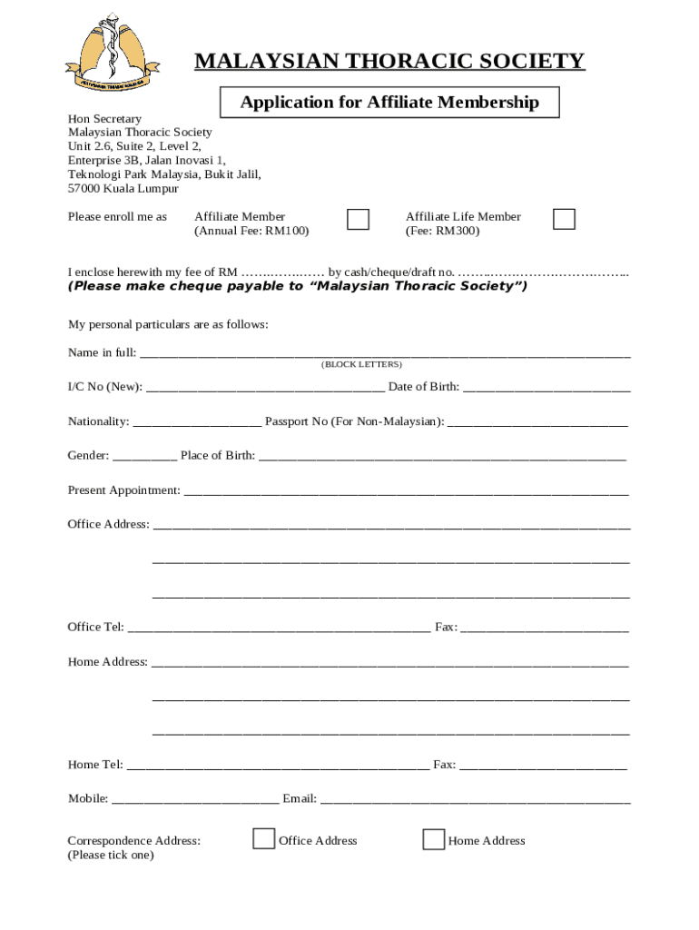 What is APPLICATION FOR MEMBERSHIPMALAYSIAN THORACIC SOCIETY - mts org Form?