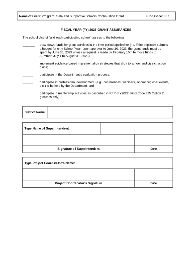 Instructions for the form FY2023 FC 337 Safe and Supportive Schools Continuation Grant Assurances