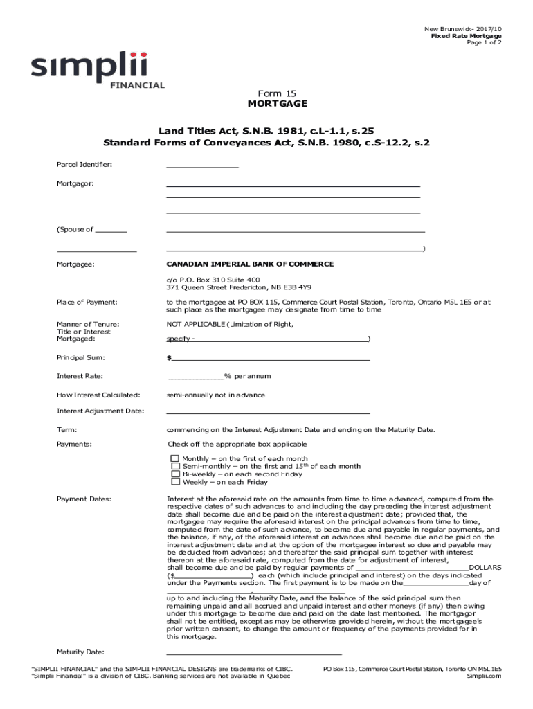 New Brunswick 2017/10 Fixed Rate Mortgage Page 1 of 2Form 15 MORTGAGE Land Titles Act, S.N.B. 1981, c.L1.1, s.25 Standard Forms of Conveyances Act, S.N.B. 1980, c.S12.2, s.2 Parcel Identifier: Mortgagor:(Spouse