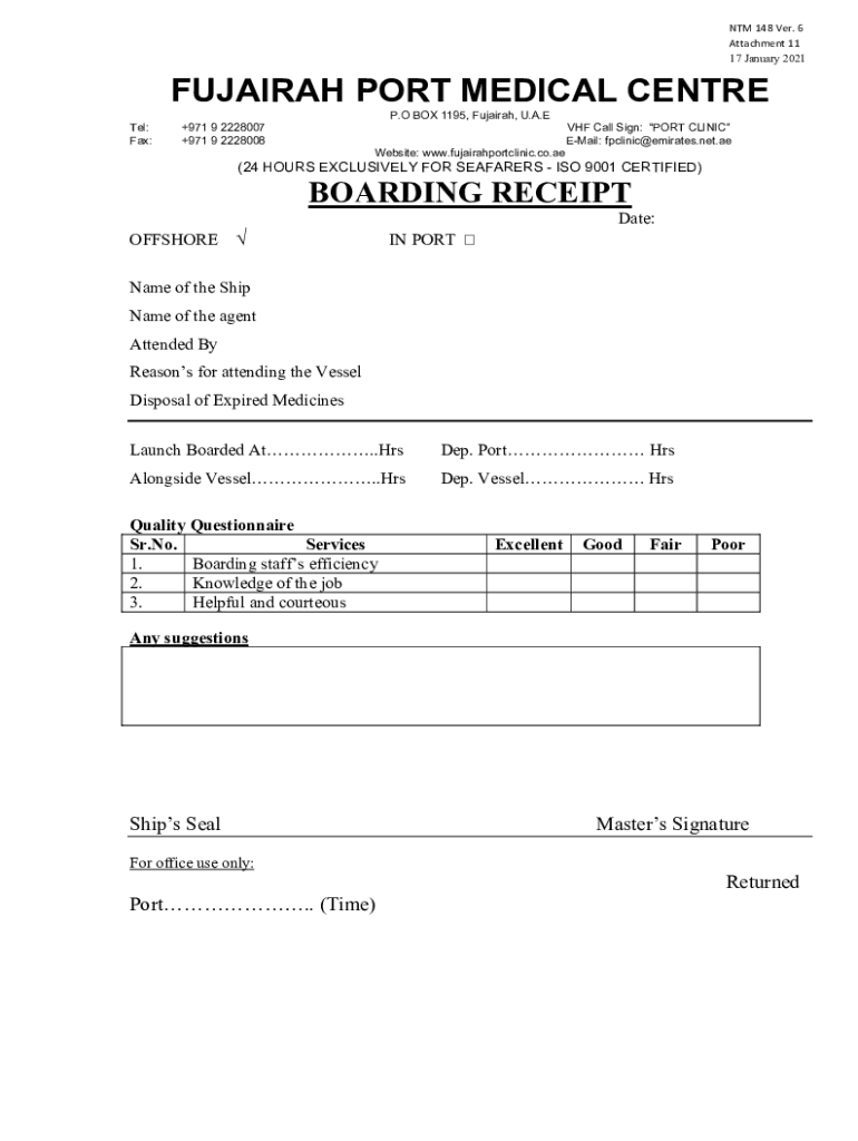 NTM 148 Ver. 6 Attachment 11 17 January 2021FUJAIRAH PORT MEDICAL CENTRE P.O BOX 1195, Fujairah, U.A.E Tel: Fax:+971 9 2228007 +971 9 2228008VHF Call Sign: PORT CLINIC EMail: fpclinic@emirates.net.ae