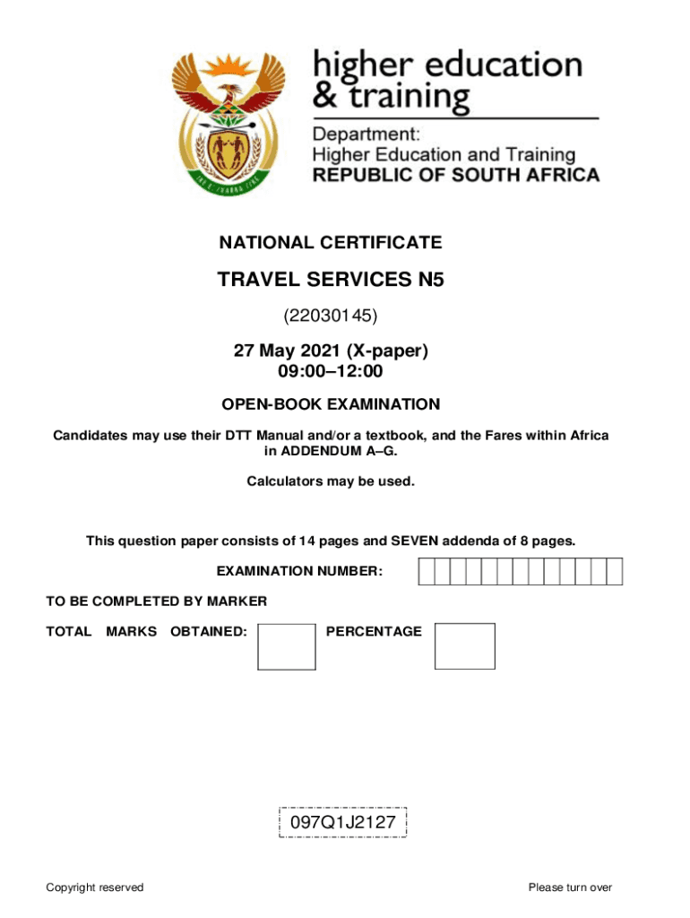 NATIONAL CERTIFICATETRAVEL SERVICES N5 (22030145) 27 May 2021 (Xpaper) 09:0012:00 OPENBOOK EXAMINATION Candidates may use their DTT Manual and/or a textbook, and the Fares within Africa in ADDENDUM