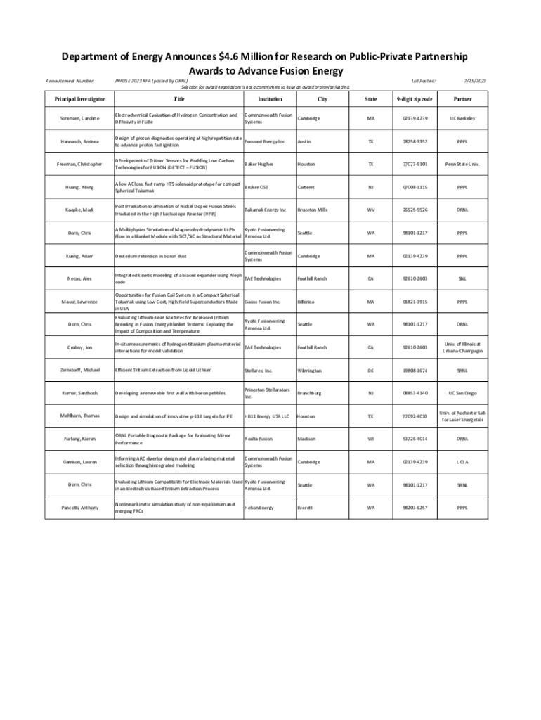 Department of Energy Announces $4.6 Million for Research on PublicPrivate Partnership Awards to Advance Fusion Energy Annoucement Number:INFUSE 2023 RFA (posted by ORNL)List Posted:7/25/2023Selection