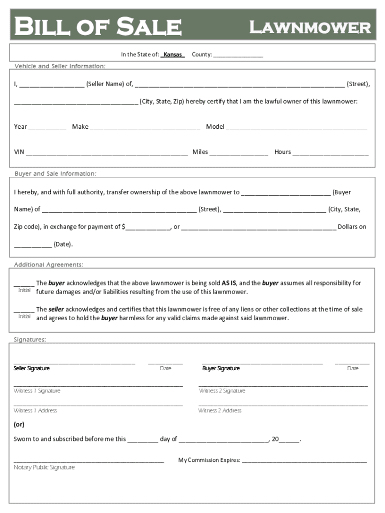 Bill of Sale In the State of: _Kansas_Lawnmower County: ___Vehicle and Seller Information:I, ___ (Seller Name) of, ___ (Street), ___ (City, State, Zip) hereby certify that I am the lawful owner of