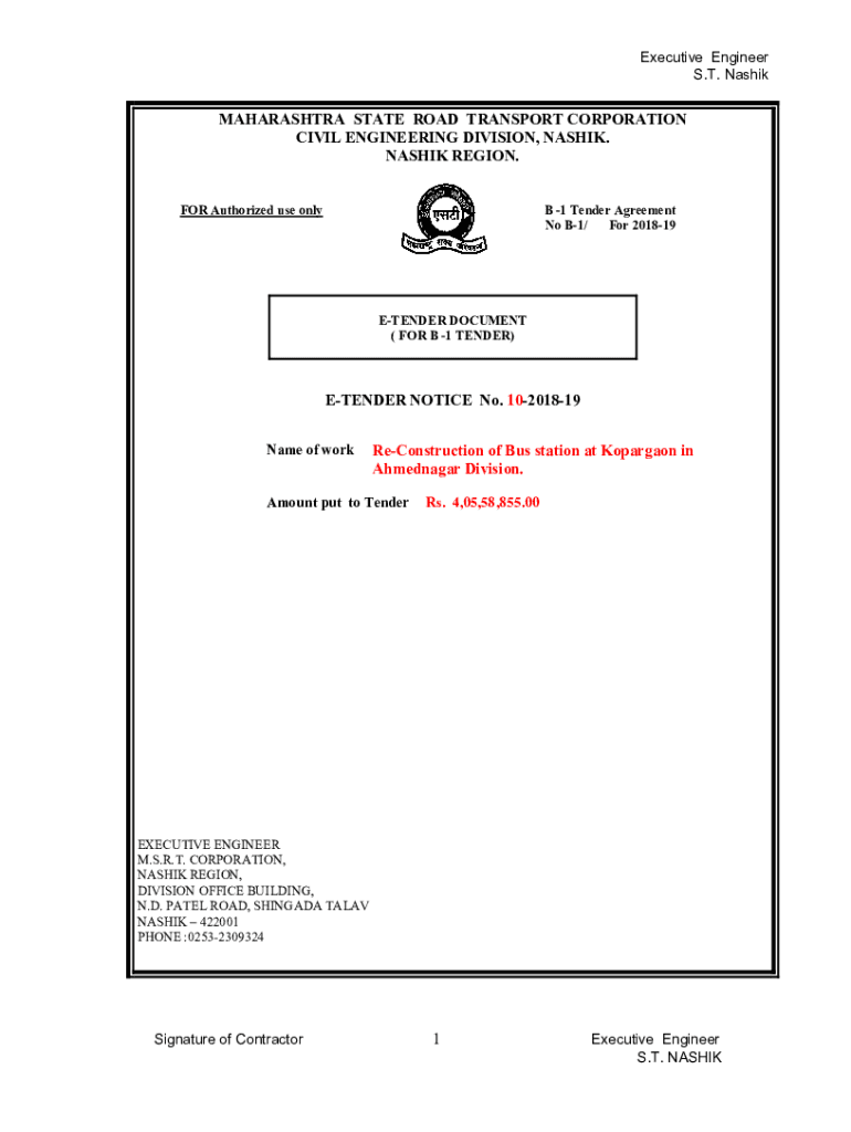Executive Engineer S.T. NashikMAHARASHTRA STATE ROAD TRANSPORT CORPORATION CIVIL ENGINEERING DIVISION, NASHIK. NASHIK REGION.B 1 Tender Agreement No B1/ For 201819FOR Authorized use onlyETENDER DOCUMENT