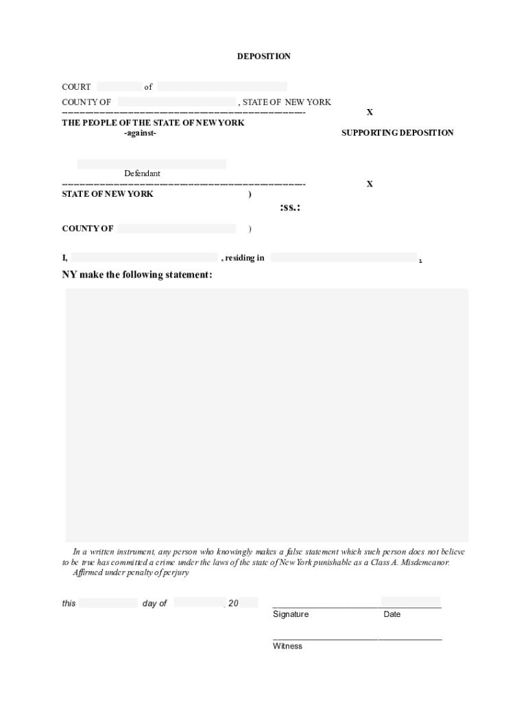 DEPOSITION COURTofCOUNTY OF , STATE OF NEW YORK THE PEOPLE OF THE STATE OF NEW YORK againstDefendant STATE OF NEW YORK )X SUPPORTING DEPOSITIONX:ss.: COUNTY OF)I,, residing in,NY make the following