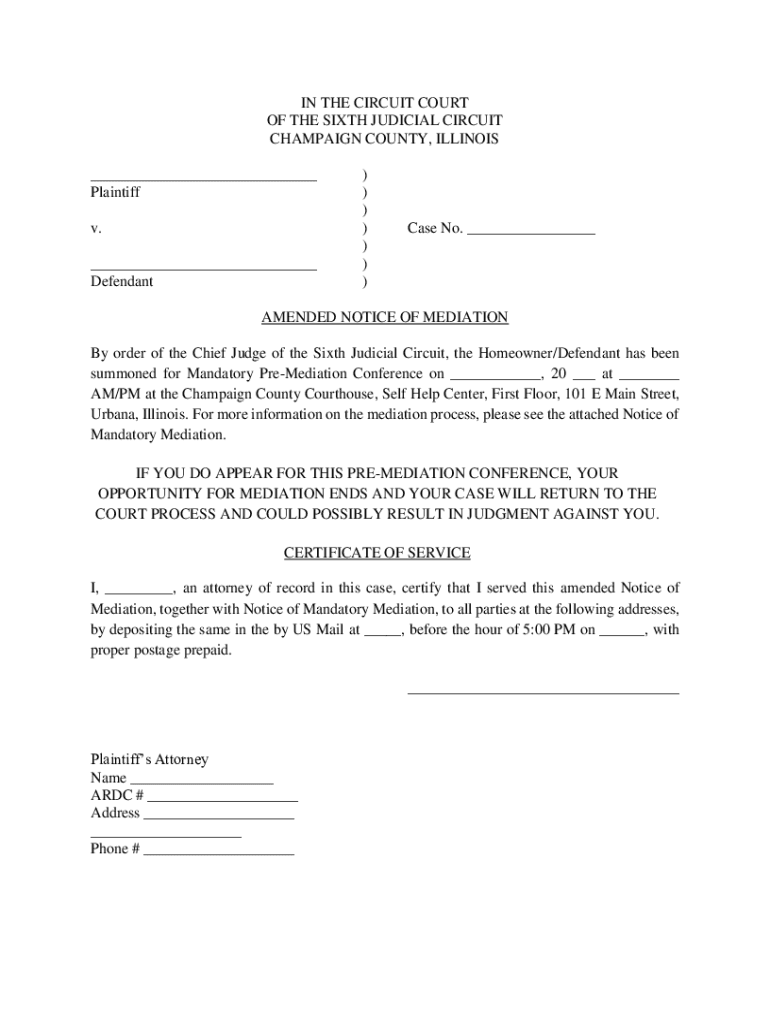 IN THE CIRCUIT COURT OF THE SIXTH JUDICIAL CIRCUIT CHAMPAIGN COUNTY, ILLINOIS ___ Plaintiff v. ___ Defendant) ) ) ) ) ) )Case No. ___AMENDED NOTICE OF MEDIATION By order of the Chief Judge of the