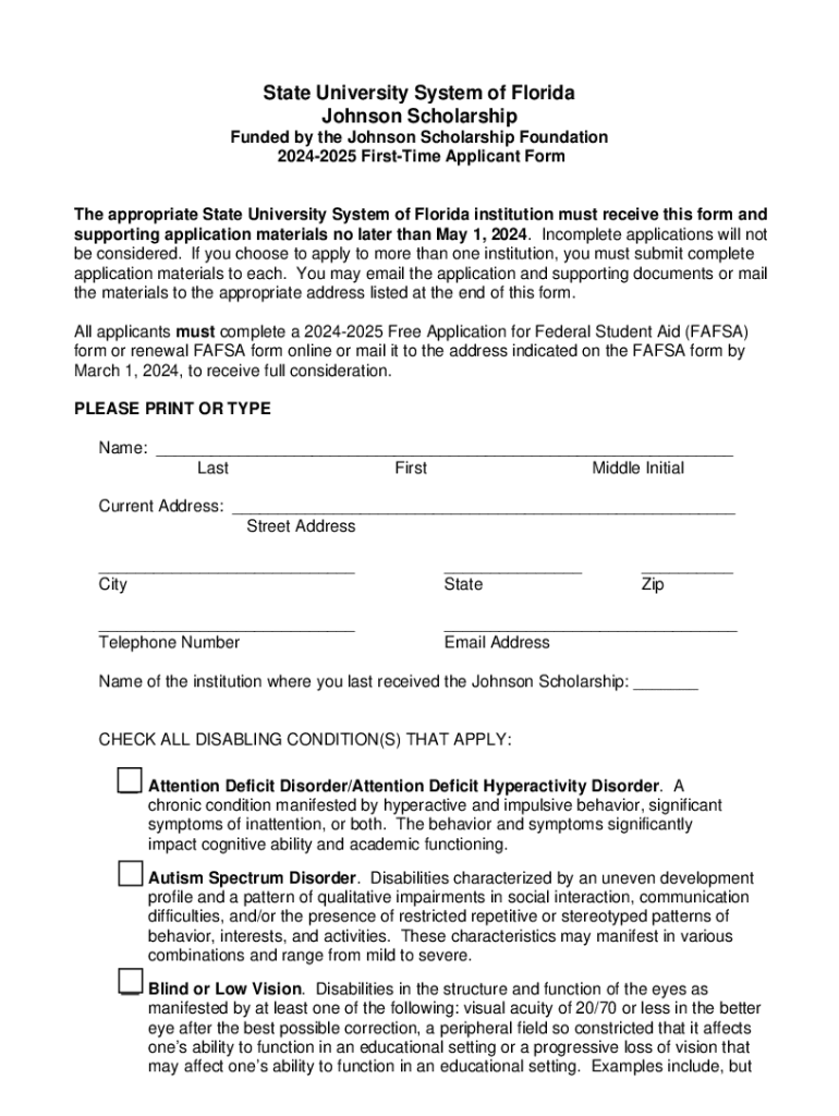 STATE UNIVERSITY SYSTEM OF FLORIDA 20242025 THEODORE R. AND VIVIAN M. JOHNSON SCHOLARSHIP* Application for FirstTime Scholar ApplicantsDEADLINE FOR APPLICATION MATERIALS TO BE RECEIVED BY THE UNIVERSITY: