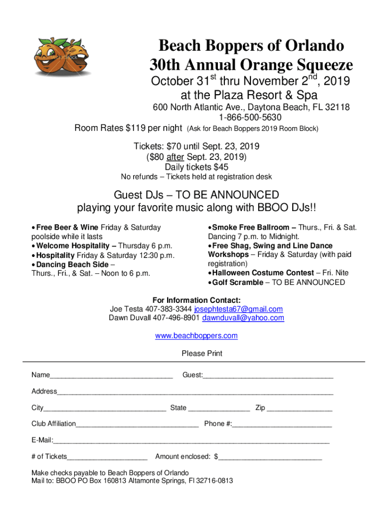 Beach Boppers of Orlando 30th Annual Orange Squeeze October 31st thru November 2nd, 2019 at the Plaza Resort & Spa600 North Atlantic Ave., Daytona Beach, FL 32118 18665005630 Room Rates $119 per night