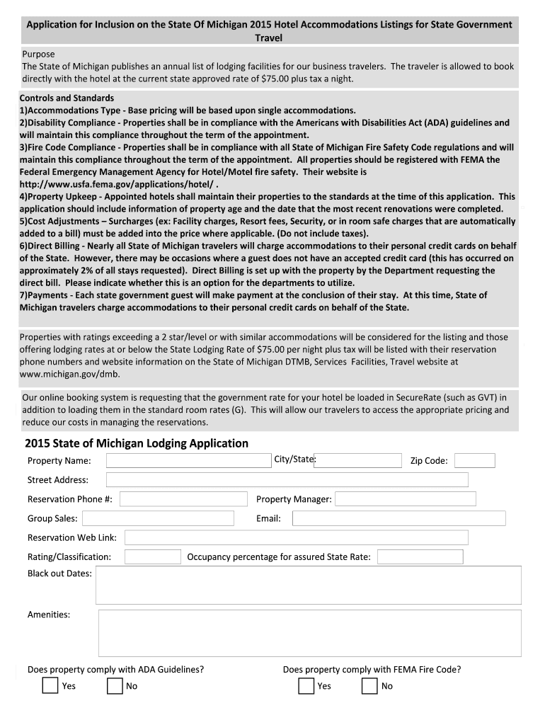 Application for Inclusion on the State Of Michigan 2015 Hotel Accommodations Listings for State Government Travel Purpose The State of Michigan publishes an annual list of lodging facilities for our
