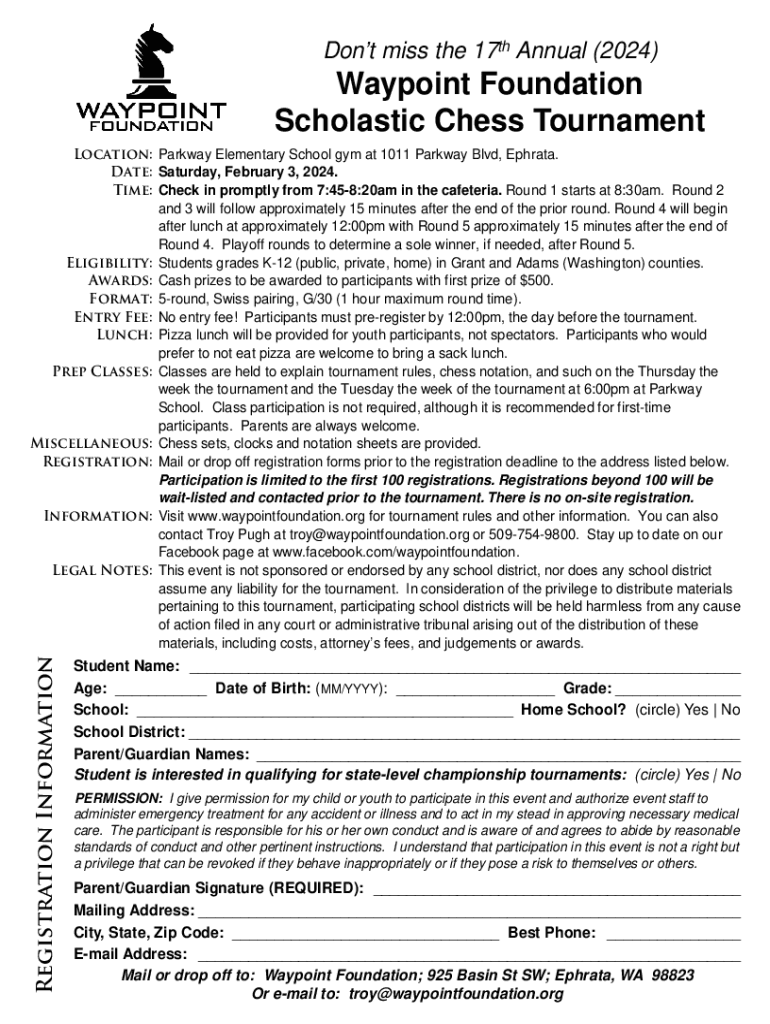 Dont miss the 17th Annual (2024)Waypoint Foundation Scholastic Chess TournamentRegistration InformationLocation: Parkway Elementary School gym at 1011 Parkway Blvd, Ephrata. Date: Saturday, February