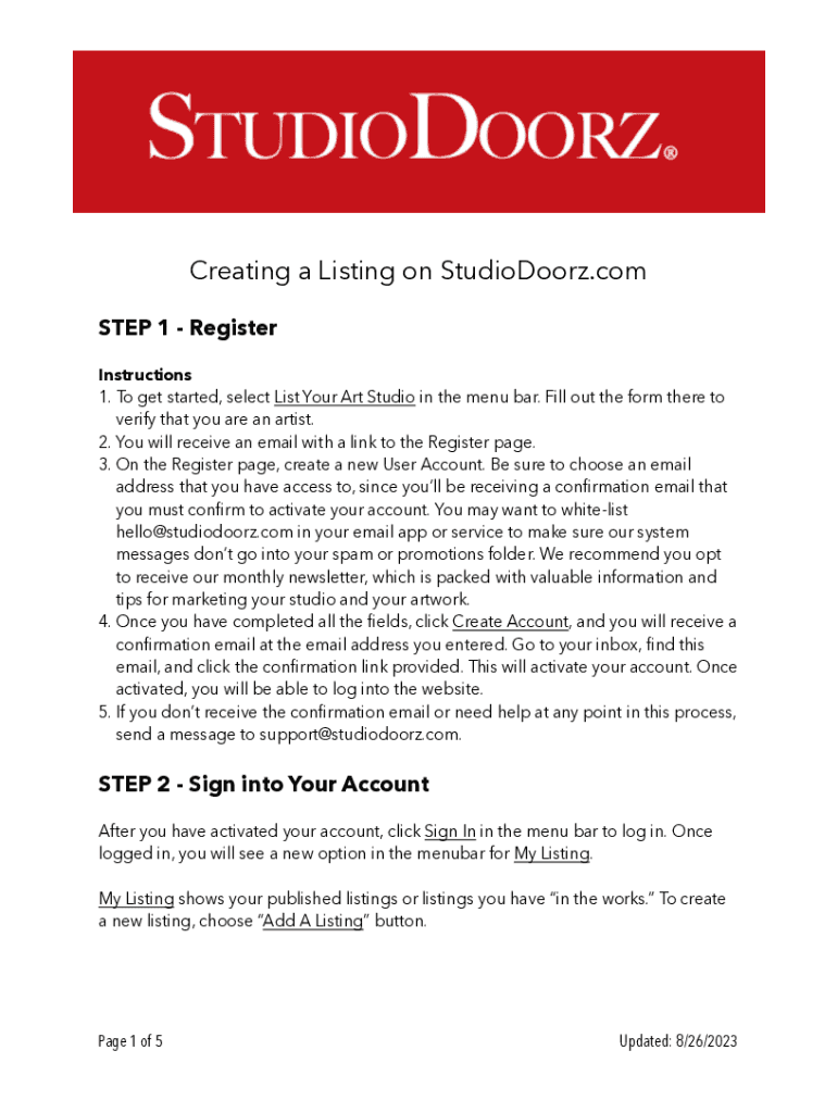 STEP 1 Register Instructions 1. To get started, select List Your Art Studio in the menu bar. Fill out the form there to verify that you are an artist. 2. You will receive an email with a link to the
