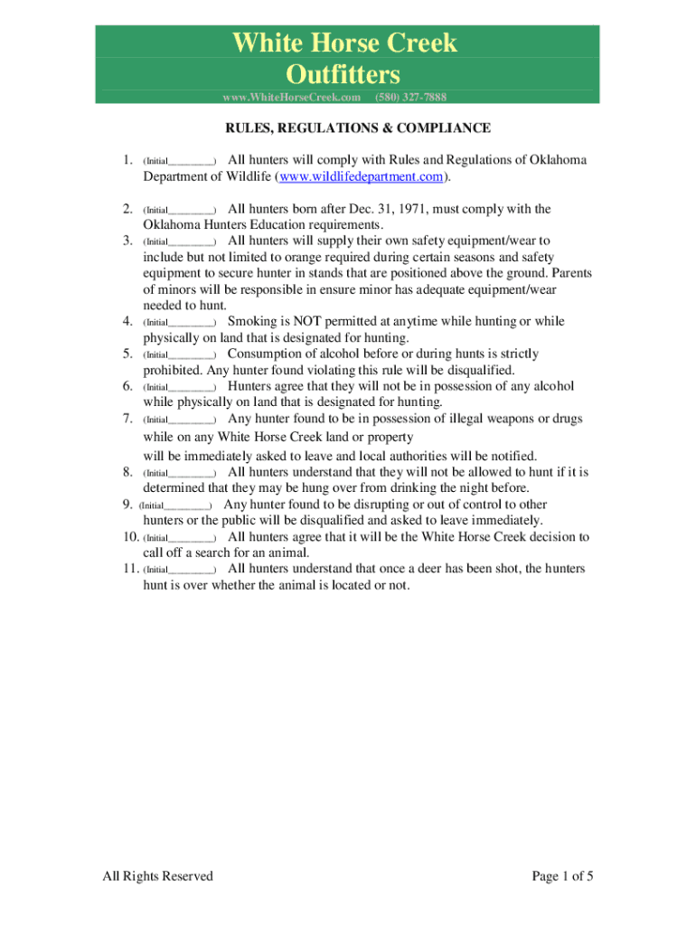 1.(Initial___) All hunters will comply with Rules and Regulations of Oklahoma