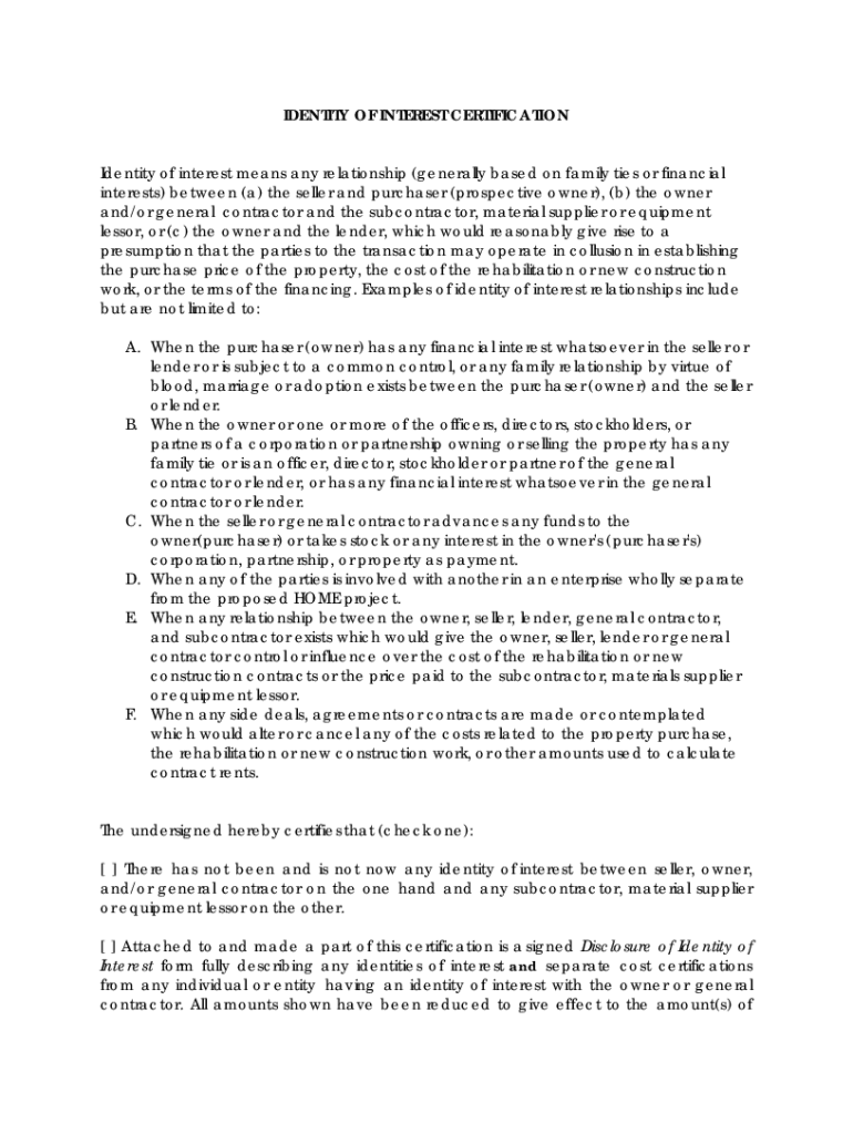 IDENTITY OF INTEREST CERTIFICATION Identity of interest means any relationship (generally based on family ties or financial interests) between (a) the seller and purchaser (prospective owner), (b)