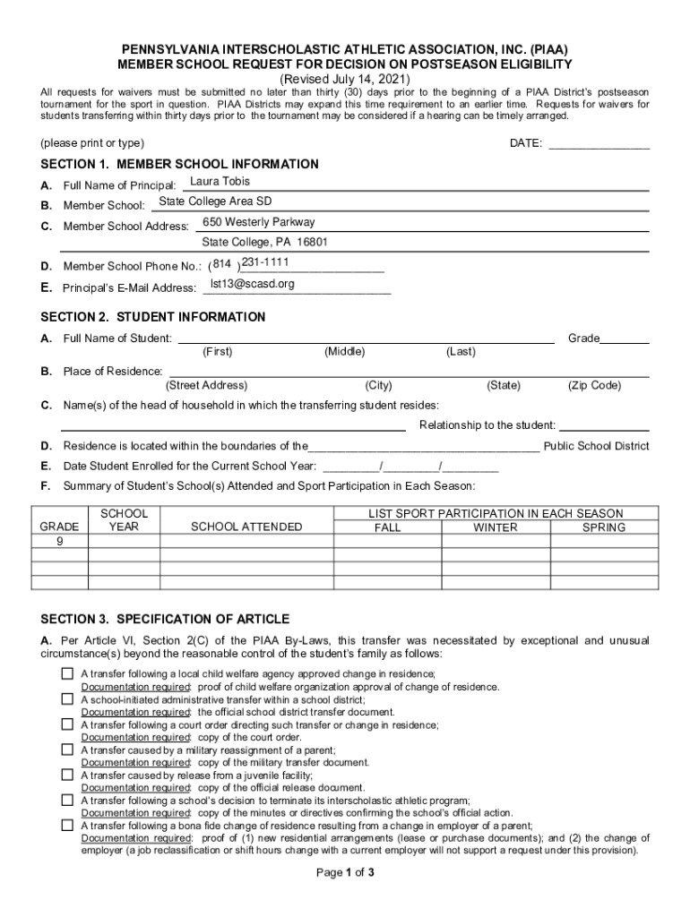 PENNSYLVANIA INTERSCHOLASTIC ATHLETIC ASSOCIATION, INC. (PIAA) MEMBER SCHOOL REQUEST FOR DECISION ON POSTSEASON ELIGIBILITY (Revised July 14, 2021)All requests for waivers must be submitted no later