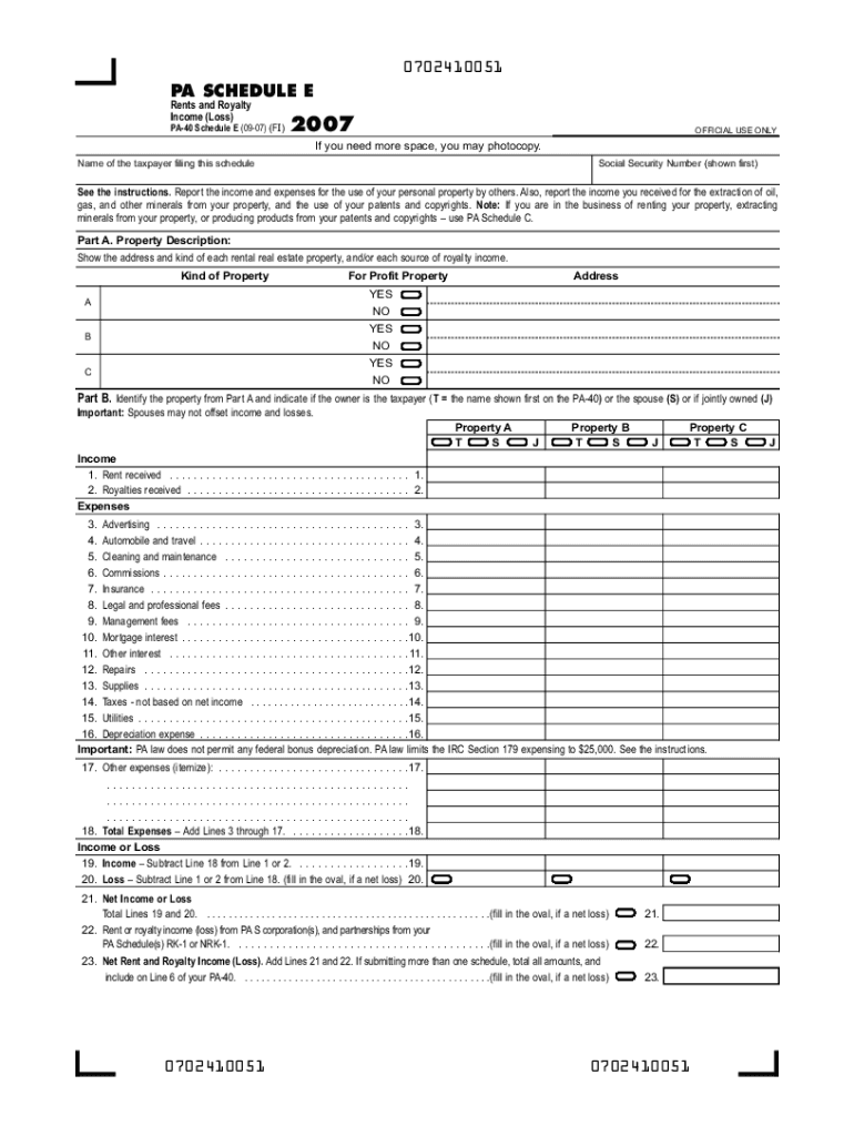 0702410051PA SCHEDULE E Rents and Royalty Income (Loss)PA40 Schedule E (0907) (FI)START HERE2007OFFICIAL USE ONLYIf you need more space, you may photocopy. Name of the taxpayer filing this scheduleSocial