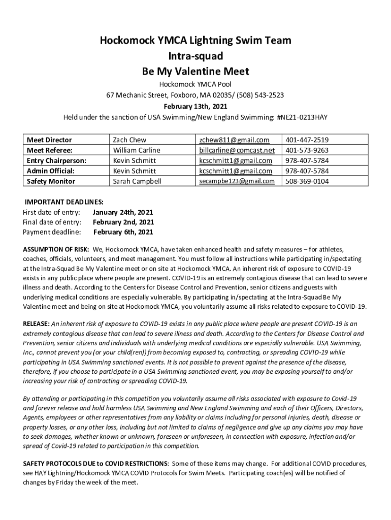 Hockomock YMCA Lightning Swim Team Intrasquad Be My Valentine Meet Hockomock YMCA Pool 67 Mechanic Street, Foxboro, MA 02035/ (508) 5432523 February 13th, 2021 Held under the sanction of USA Swimming/New