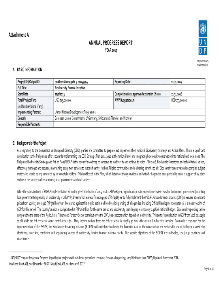 Attachment A ANNUAL PROGRESS REPORT1 YEAR 2017A. BASIC INFORMATION Project ID / Output ID Full Title: Start Date Total Project Fund: (and fund revisions, if any) Implementing Partner: Donor/s Responsible