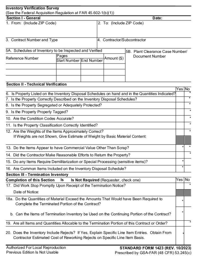 Inventory Verification Survey (See the Federal Acquisition Regulation at FAR 45.6021(b)(1)) Section I General 2. To: (Include ZIP Code) 1. From: (Include ZIP Code)3. Contract Number and TypeD ate:4.