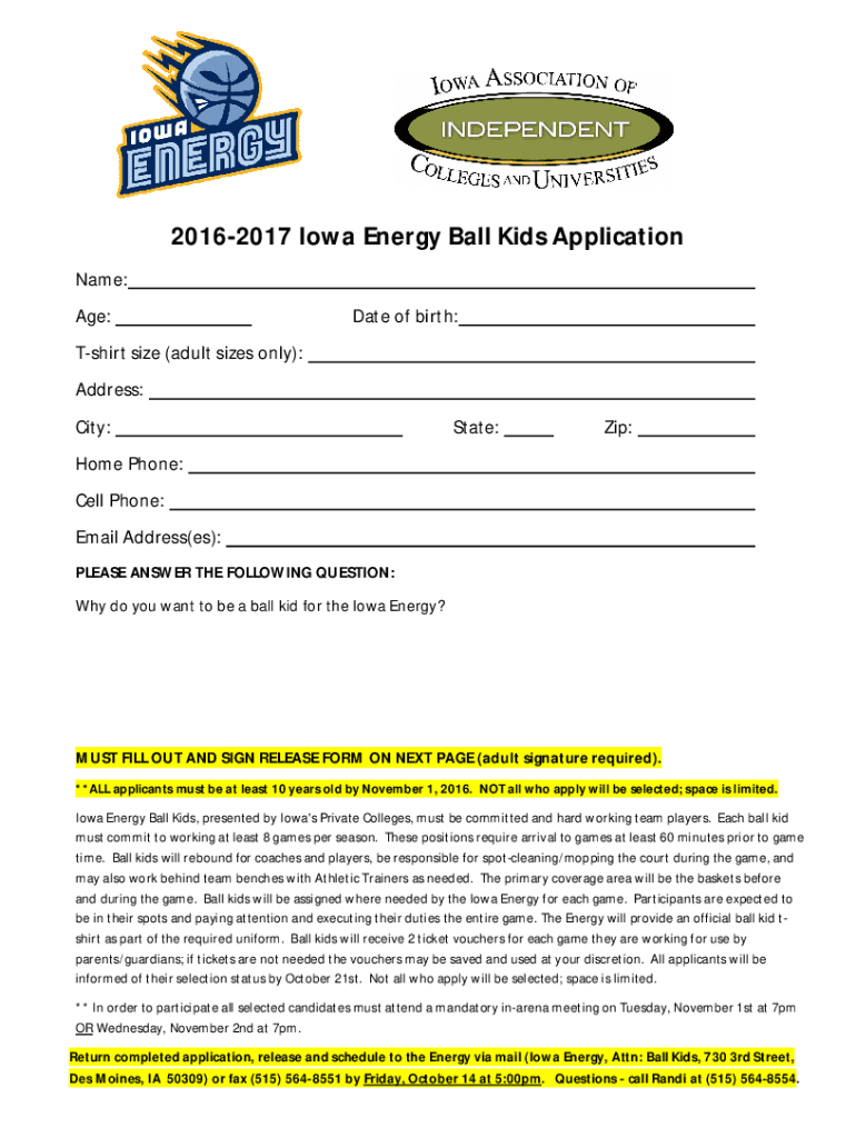 Get the free 2016-2017 Iowa Energy Ball Kids Application