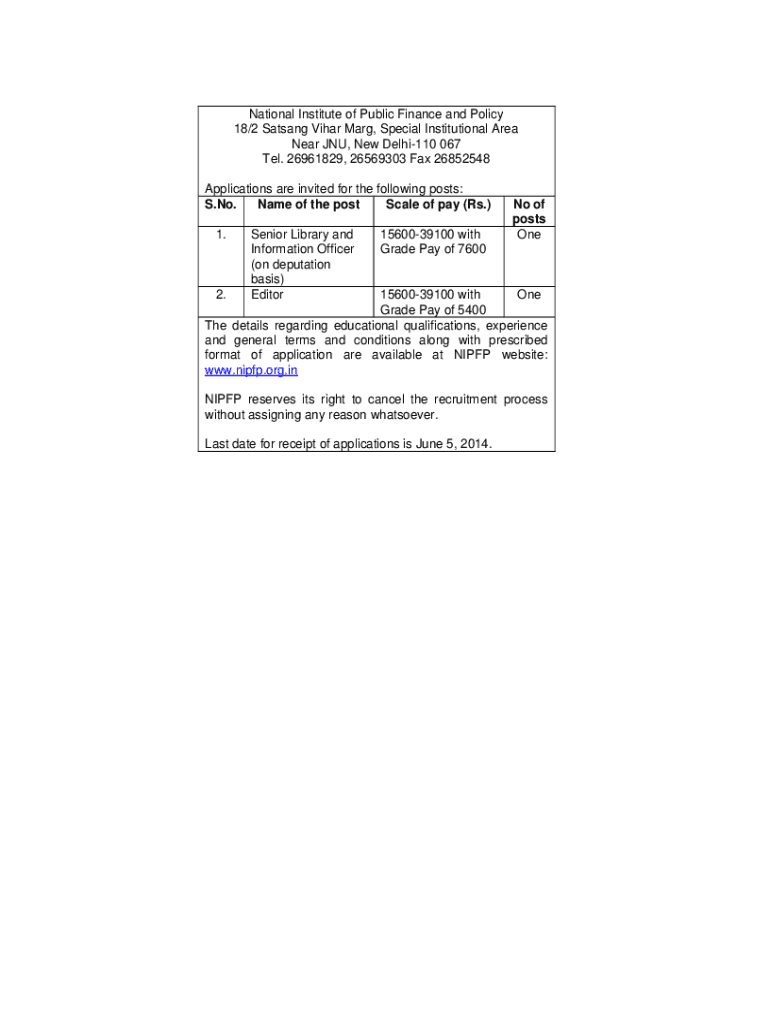 National Institute of Public Finance and Policy 18/2 Satsang Vihar Marg, Special Institutional Area Near JNU, New Delhi110 067 Tel. 26961829, 26569303 Fax 26852548 Applications are invited for the