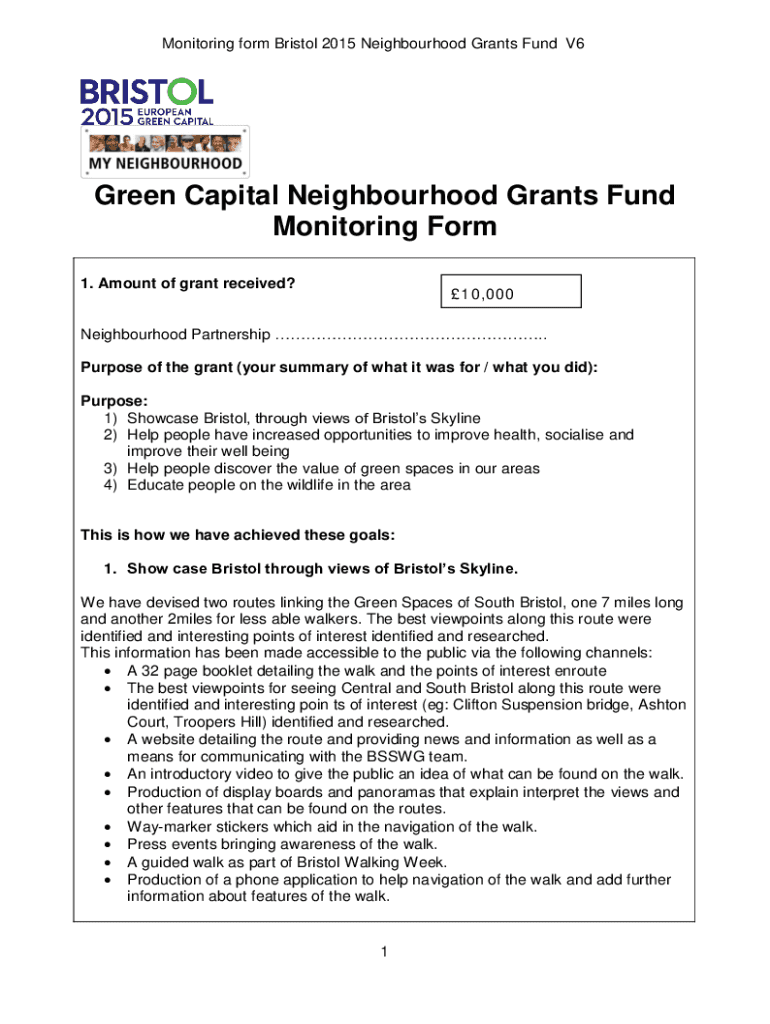 Monitoring form Bristol 2015 Neighbourhood Grants Fund V6Green Capital Neighbourhood Grants Fund Monitoring Form 1. Amount of grant received?10,000Neighbourhood Partnership .. Purpose of the grant