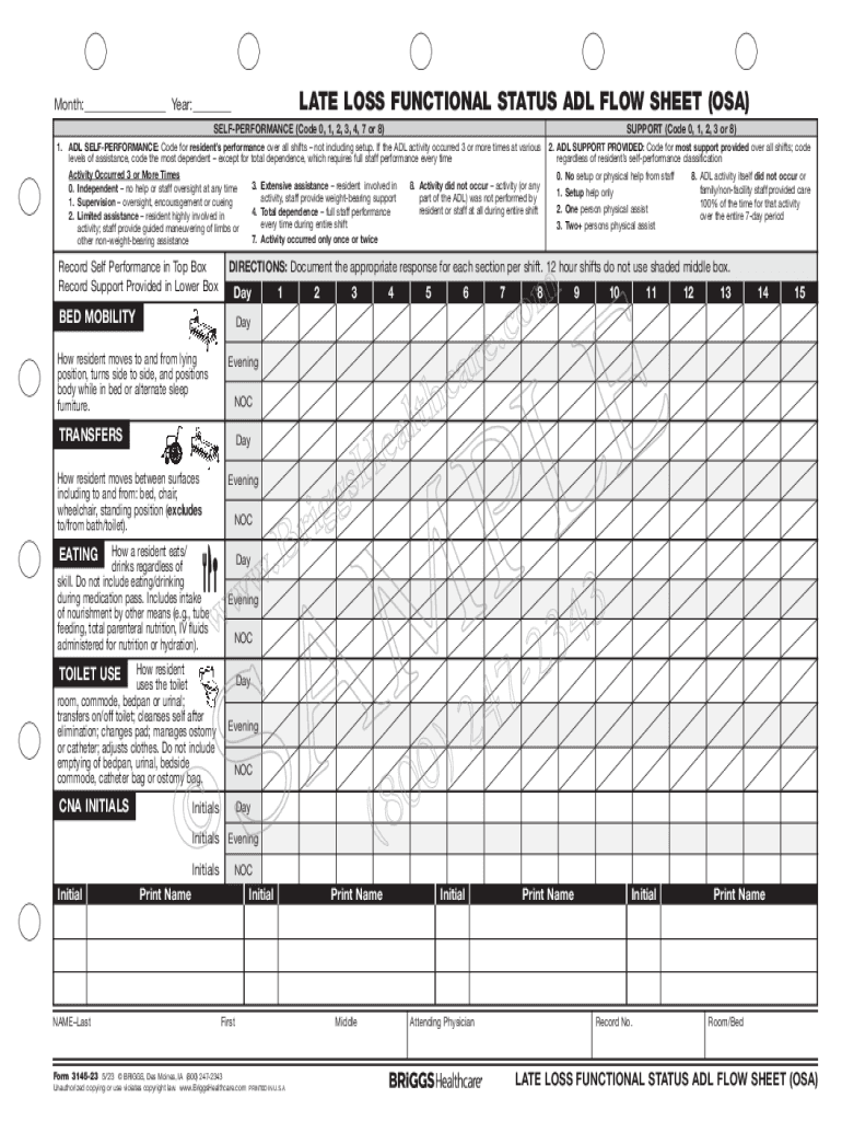 LATE LOSS FUNCTIONAL STATUS ADL FLOW SHEET (OSA)Month:___ Year:___SELFPERFORMANCE (Code 0, 1, 2, 3, 4, 7 or 8)SUPPORT (Code 0, 1, 2, 3 or 8)1. ADL SELFPERFORMANCE: Code for residents performance over