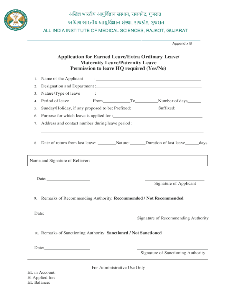 Appendix BApplication for Earned Leave/Extra Ordinary Leave/