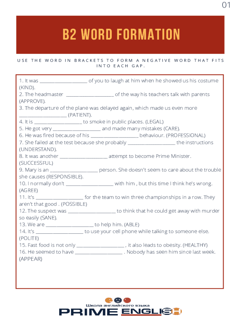 01B2 WORD FORMATION USE THE WORD IN BRACKETS TO FORM A NEGATIVE WORD THAT FITS INTO EACH GAP.1. It was ___ of you to laugh at him when he showed us his costume (KIND). 2. The headmaster ___ of the