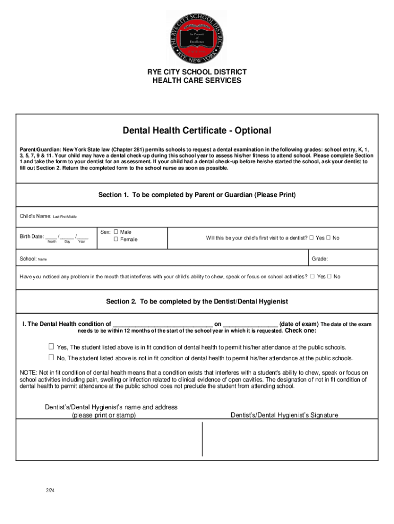 RYE CITY SCHOOL DISTRICT HEALTH CARE SERVICESDental Health Certificate Optional Parent/Guardian: New York State law (Chapter 281) permits schools to request a dental examination in the following grades: