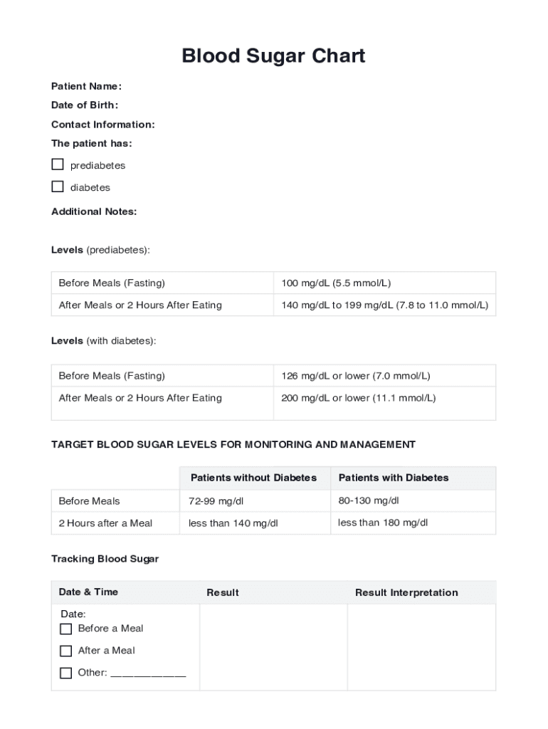 Blood Sugar Chart Patient Name: Date of Birth: Contact Information: The patient has: prediabetes diabetes Additional Notes:Levels (prediabetes):Before Meals (Fasting)100 mg/dL (5.5 mmol/L)After Meals