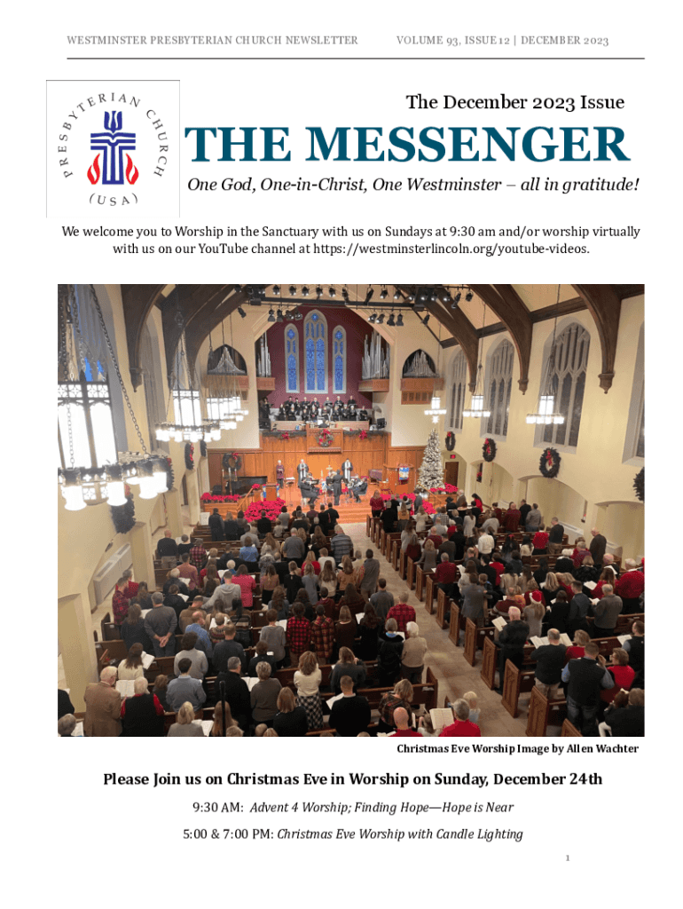 VOLUME 93, ISSUE 12 | DECEMBER 2023The December 2023 IssueTHE MESSENGER One God, OneinChrist, One Westminster all in gratitude! We welcome you to Worship in the Sanctuary with us on Sundays at 9:30