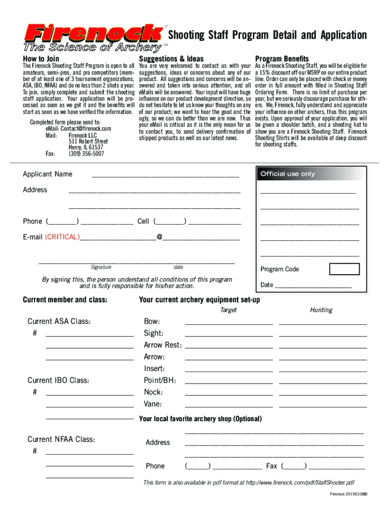 Shooting Staff Program Detail and Application How to JoinThe Firenock Shooting Staff Program is open to all amateurs, semipros, and pro competitors (member of at least one of 3 tournament organizations,