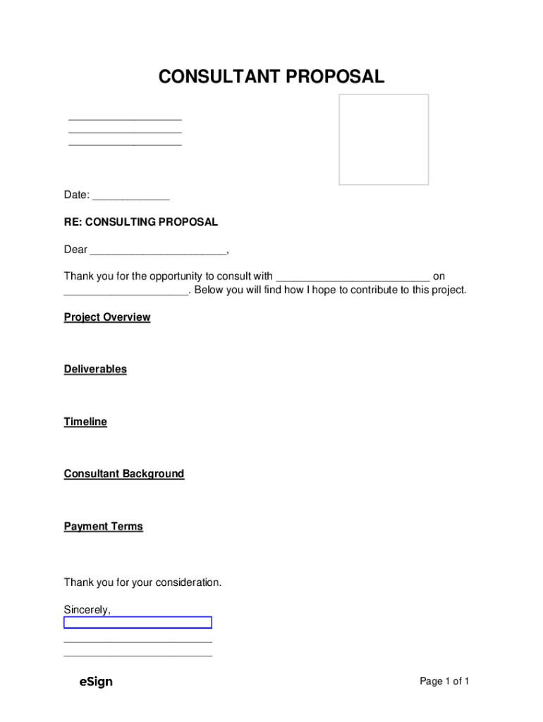 CONSULTANT PROPOSAL ___ ___ ___Date: ___ RE: CONSULTING PROPOSAL Dear ___, Thank you for the opportunity to consult with ___ on ___. Below you will find how I hope to contribute to this project. Project
