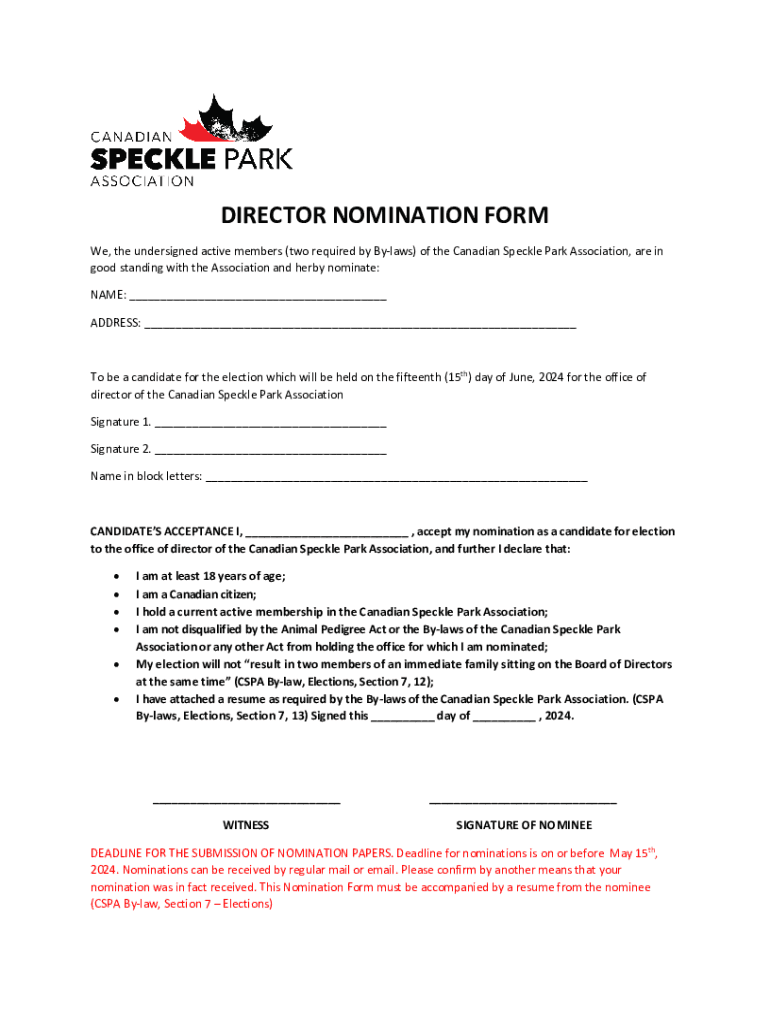 DIRECTOR NOMINATION FORM We, the undersigned active members (two required by Bylaws) of the Canadian Speckle Park Association, are in good standing with the Association and herby nominate: NAME: ___