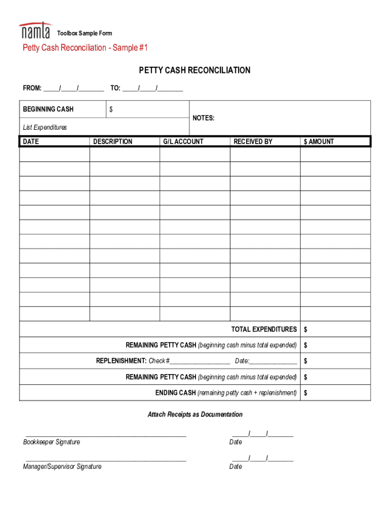 Toolbox Sample FormPetty Cash Reconciliation Sample #1 PETTY CASH RECONCILIATION FROM: ___/___/___ TO: ___/___/___ BEGINNING CASH$ NOTES:List Expenditures DATEDESCRIPTIONG/L ACCOUNTRECEIVED BY$ AMOUNTTOTAL