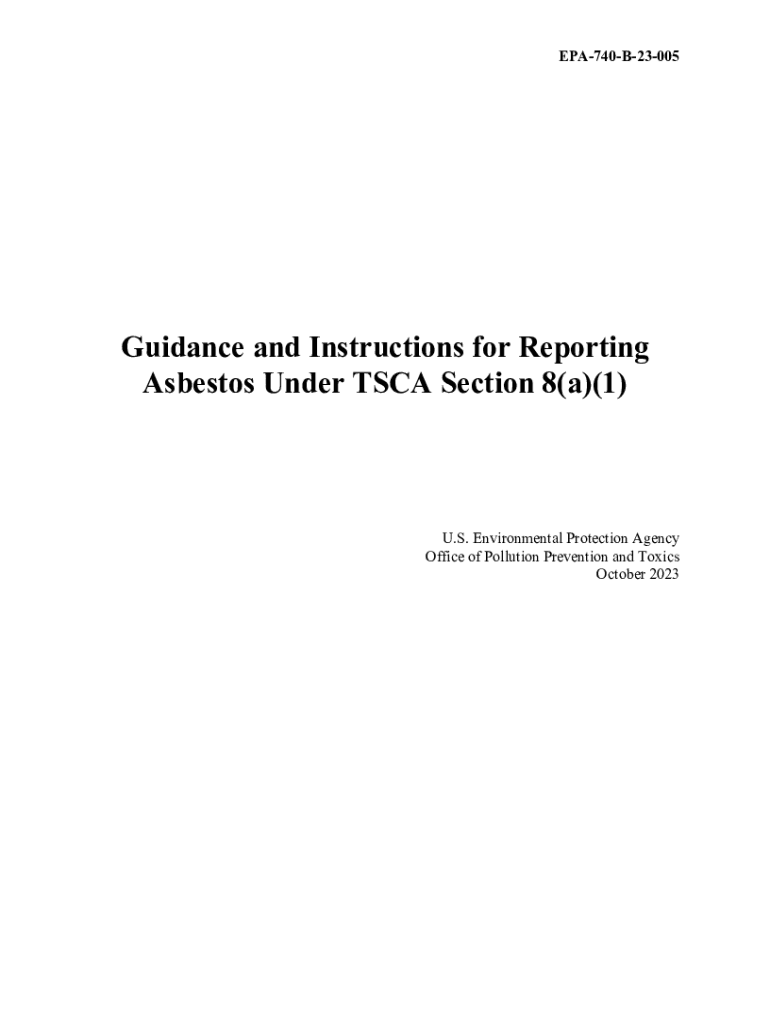 EPA740B23005Guidance and Instructions for Reporting Asbestos Under TSCA Section 8(a)(1)U.S. Environmental Protection Agency Office of Pollution Prevention and Toxics October 2023DOCUMENT HISTORY Document
