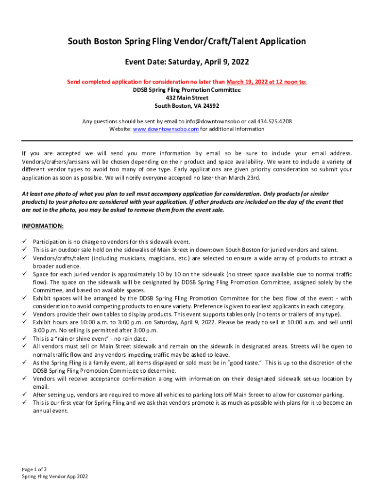 South Boston Spring Fling Vendor/Craft/Talent ApplicationEvent Date: Saturday, April 9, 2022Send completed application for consideration no later than March 19, 2022, at 12 noon to:DDS Spring Fling