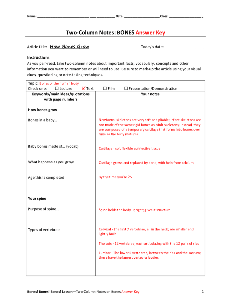 Name: ___ Date: ___ Class: ___Column Notes: BONES Answer Key